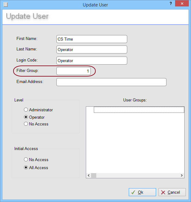 When the Update User window is displayed, enter the Filter Group number that you have defined above (1 for employees who are in the Admin and Support Departments).