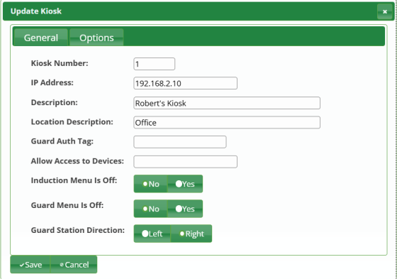 From the setup options page, select the kiosks button to configure a kiosk or change a kiosks settings.