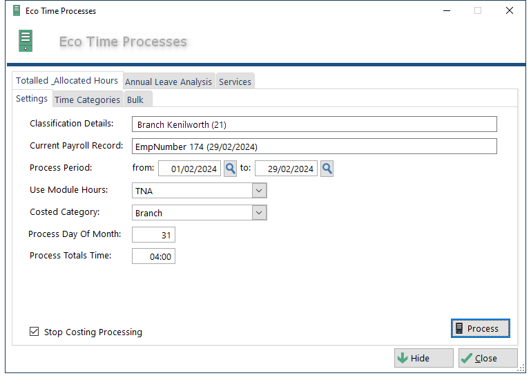 The Eco Time Processes module was introduced in Eco Time version 2026.01.05. The primary purpose of this module is to execute batched background processes that are too resource-intensive or time-consuming to run in real time. These processes are typically scheduled to run after hours in an offline batch mode, ensuring that normal system performance is not impacted during business hours.